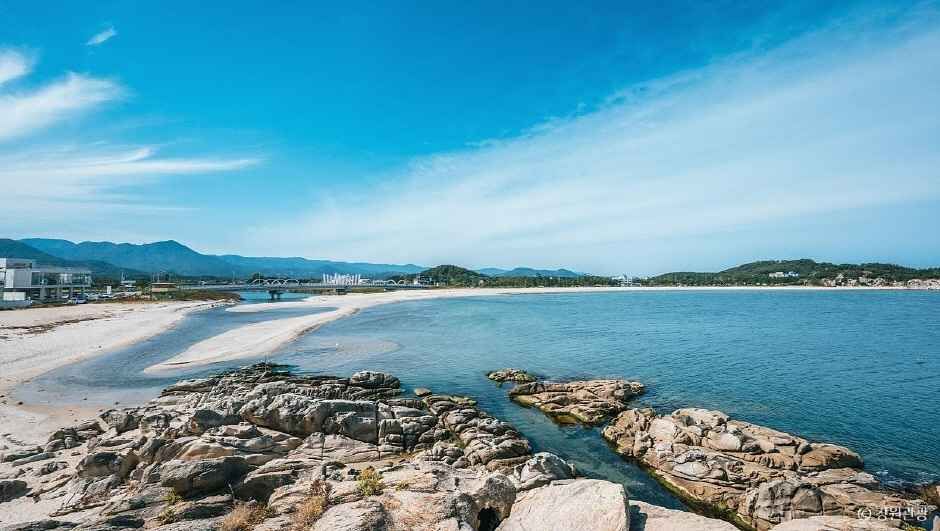 넓고 완만한 백사장과 울창한 송림이 어우러진 고성 대표 해수욕장입니다. 서핑과 산책 모두 즐길 수 있어 여름철 피서객이 많습니다.