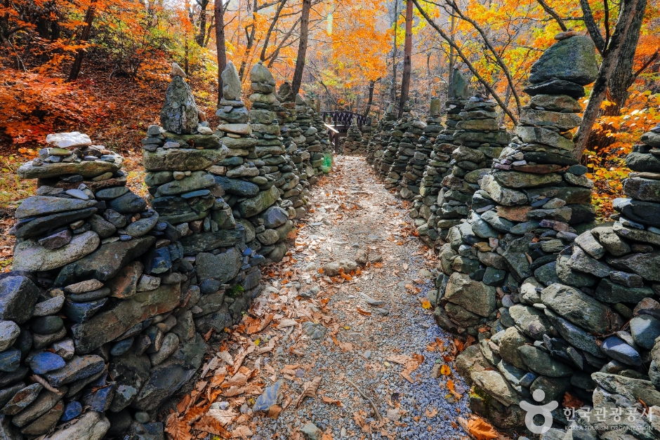 숲길 따라 줄지어 있는 돌탑은 신비로운 분위기를 자아냅니다.