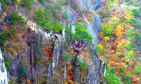 암석 지형과 단풍이 어우러지는 독특한 단풍 풍경을 감상할 수 있어요.