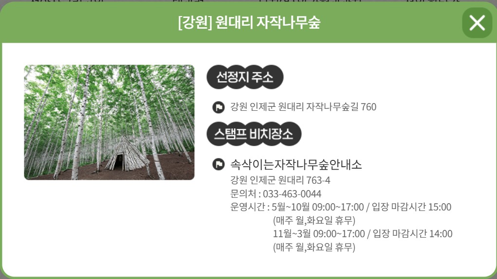 이 숲은 청정한 숲길과 순백의 나무 줄기로 힐링 명소로 자리 잡았으며, 한국관광공사가 선정한 ‘한국관광 100선’에도 포함되어 있습니다. (선정 이유는 자연생태, 경관 우수성 등)