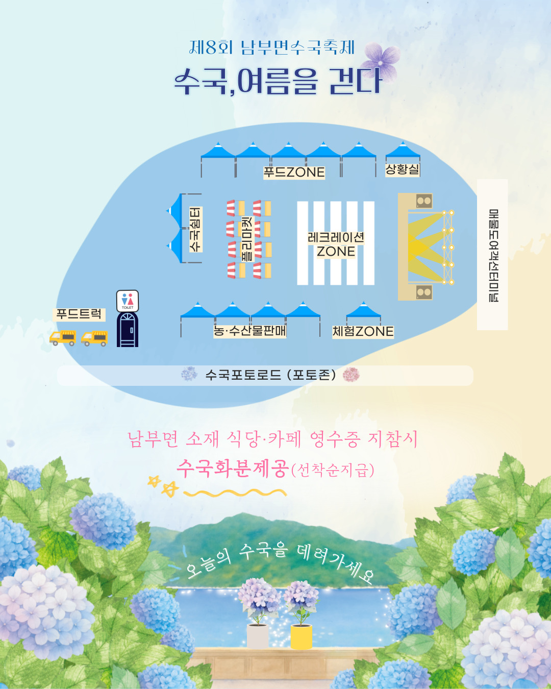거제 저구항 수국축제, 남부면 수국축제에서는 특별한 이벤트도 준비되어 있습니다. 축제 기간 남부면 소재 식당이나 카페를 이용하고 영수증을 제출하면 수국화분을 증정하는 이벤트가 진행됩니다. 남부면의 맛집과 카페도 즐기고, 예쁜 수국화분까지 받을 수 있는 기회이니 꼭 참여해보세요.