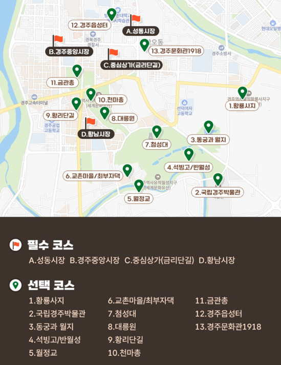 | 시내권 | 1. 성동시장, 월성(석빙고), 첨성대, 대릉원(천마총), 봉황대, 중앙시장 2. 오릉, 경주향교, 국립경주박물관, 동궁과월지, 분황사 |