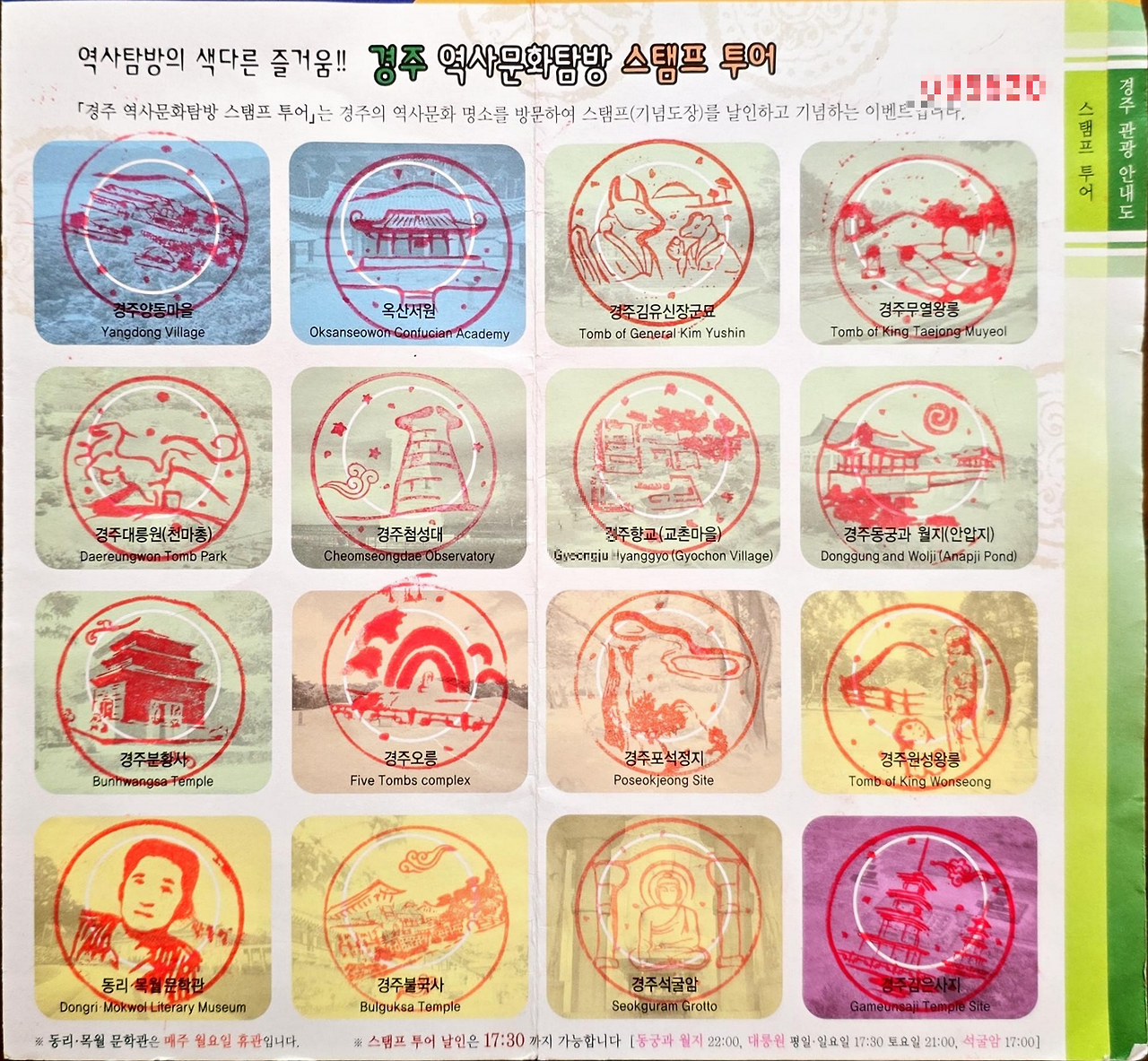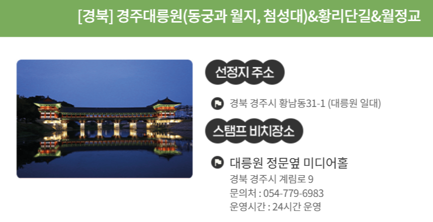 - 대릉원(동궁과 월지, 첨성대), 황리단길, 월정교: 대릉원 정문 옆 미디어홀에 스탬프 비치.
