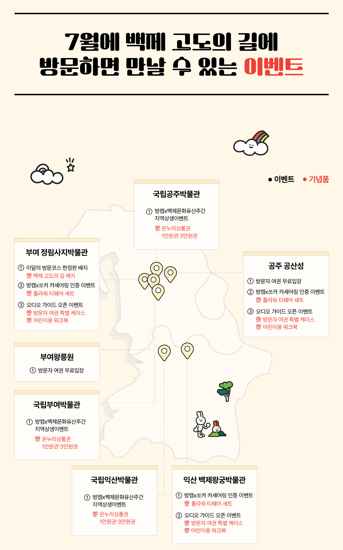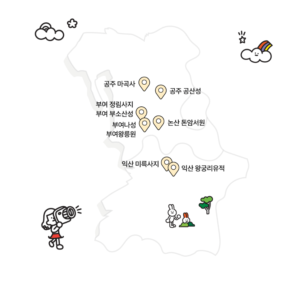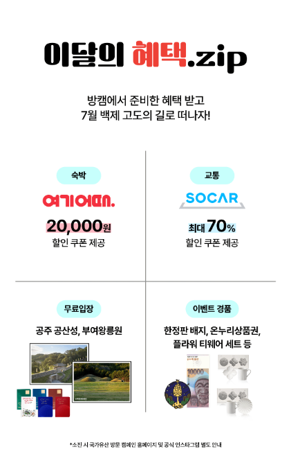 - 무료/할인 입장: 방문자 여권 소지자에 한해 공주 공산성, 부여 왕릉원 무료 입장