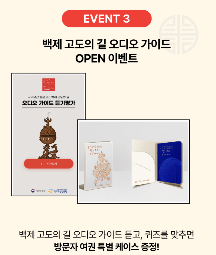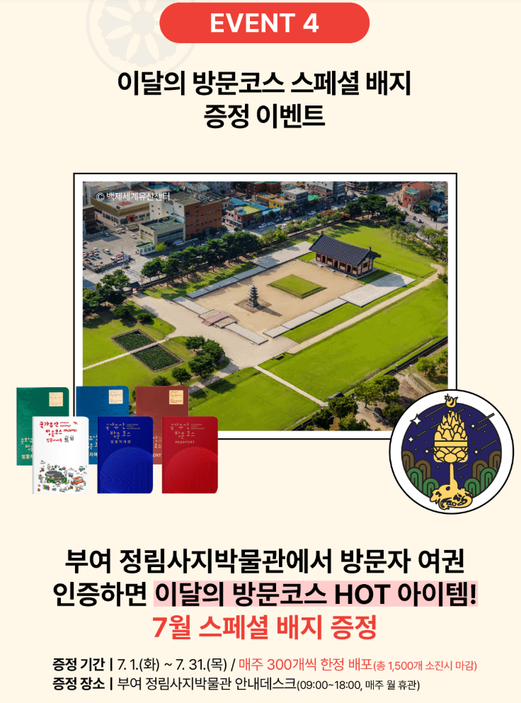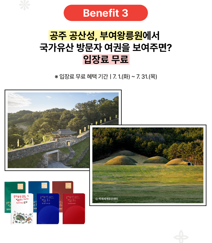 국가유산방문자 여권은 단순한 여행 아이템을 넘어, 우리 문화유산의 소중함을 직접 체험하고, 다양한 혜택과 추억을 쌓을 수 있는 특별한 기회입니다. 7월에는 ‘백제 고도의 길’을 따라 백제의 역사와 문화를 만끽하고, 국가유산방문자 여권으로만 누릴 수 있는 알찬 혜택도 꼭 챙겨보세요.