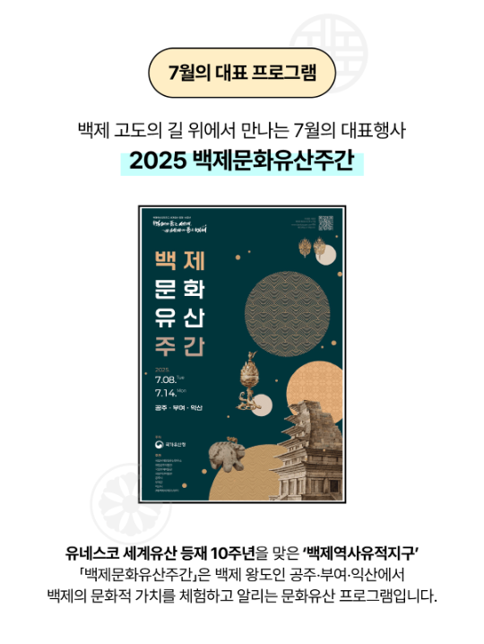 특히 7월에는 백제문화유산주간 및 백제역사유적지구 세계유산 등재 10주년 기념행사가 함께 열려, 다양한 문화체험과 이벤트도 함께 즐길 수 있습니다.