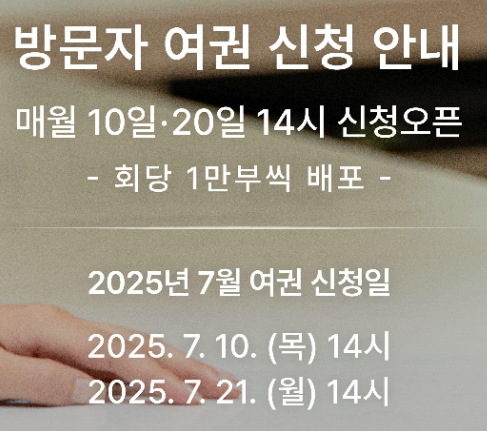 2025년 국가유산방문자 여권은 매월 10일과 20일, 오후 2시(14시)에 신청이 가능합니다. 만약 신청일이 공휴일이라면, 그 다음 평일에 신청이 진행됩니다. 2025년 7월은 7월 10일(목)과 7월 21일(월)에 각각 1만부씩 선착순으로 배포됩니다.
