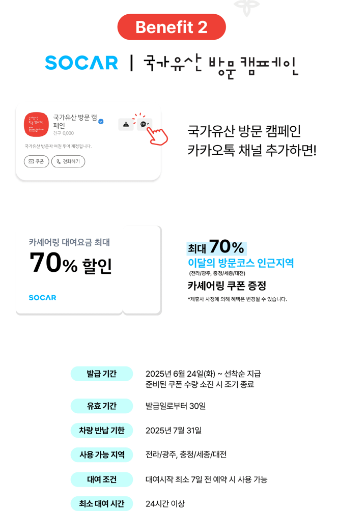 - 교통 할인: 쏘카 차량 임차 할인 쿠폰 증정(카카오톡 채널 추가 시)