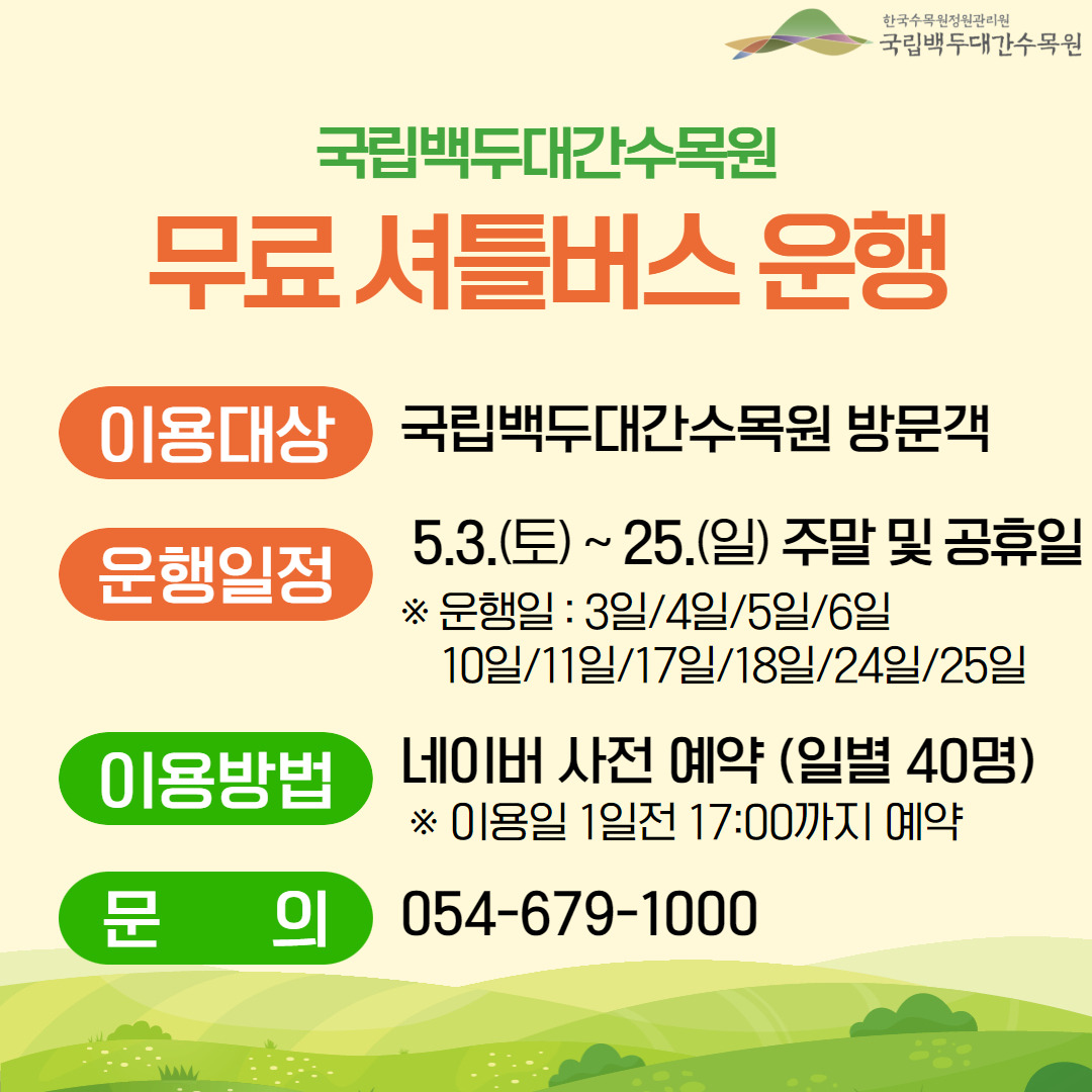 국립백두대간수목원은 매일 오전 9시부터 오후 6시까지 운영됩니다.
