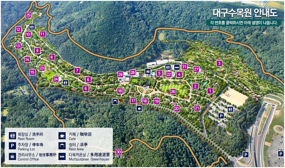 - 20개 이상의 테마정원 운영: 활엽수원, 약용식물원, 습지원, 분재원 등