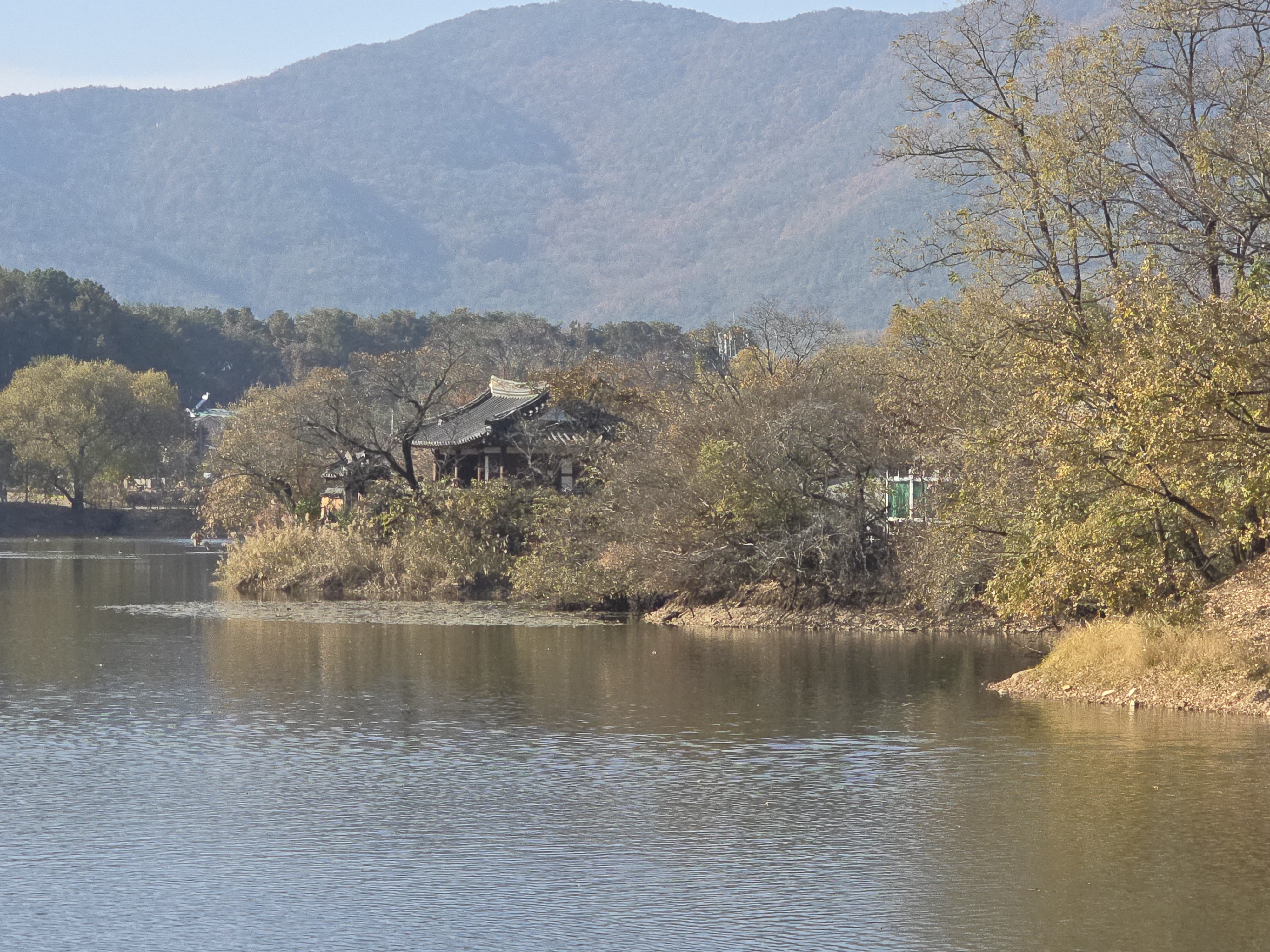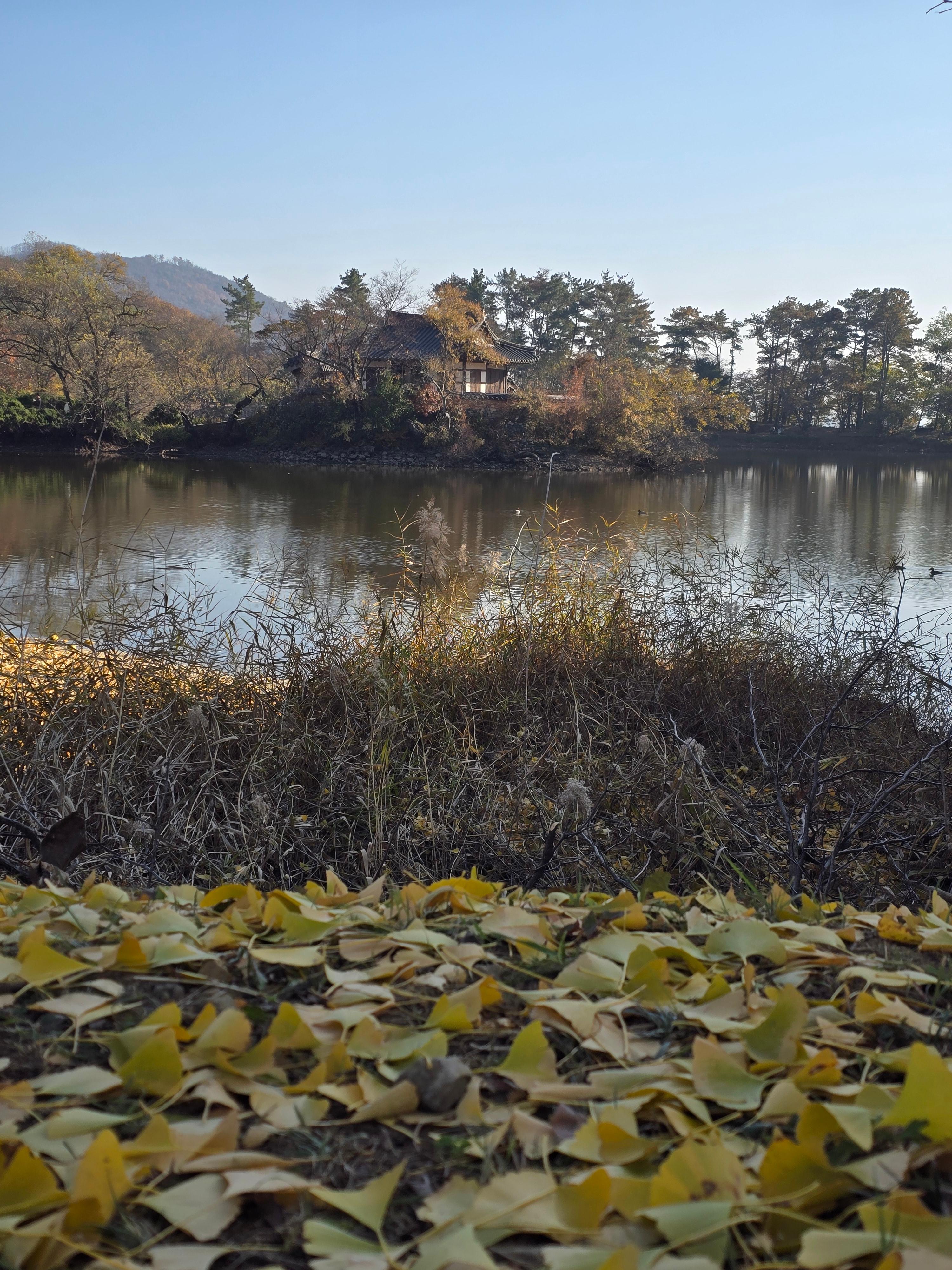 화려한 단풍이 모두 지고 난 후, 위양지는 한층 더 고요한 모습으로 우리를 맞이합니다. 완재정 주변에 드문드문 남은 나뭇잎과, 떨어진 낙엽이 수면 위를 스치며 만들어내는 풍경은 가을의 끝자락이라는 느낌을 강하게 전해줍니다.