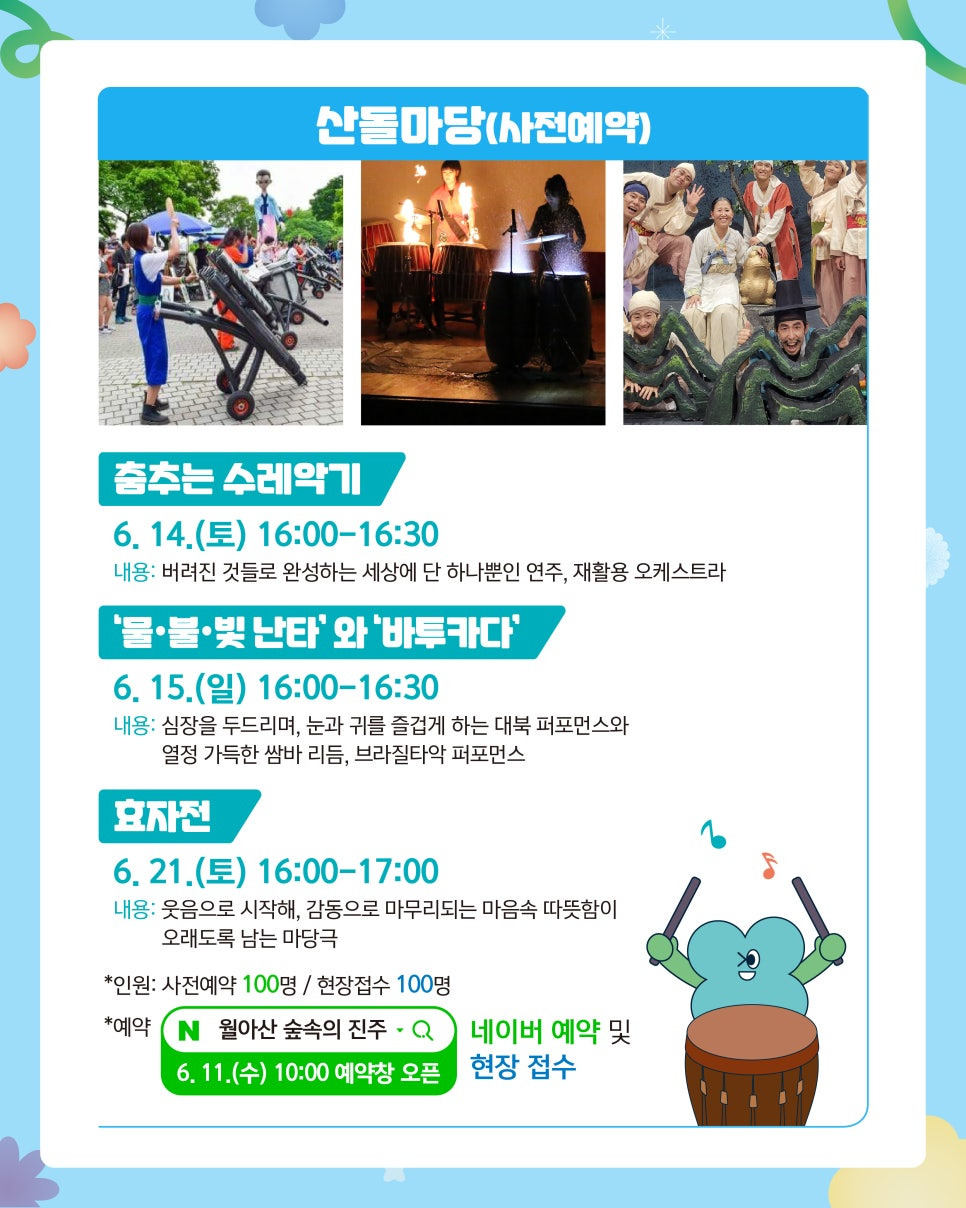 - 장소: 경상남도 진주시 진성면 달음산로 313, 월아산 숲속의 진주 일원