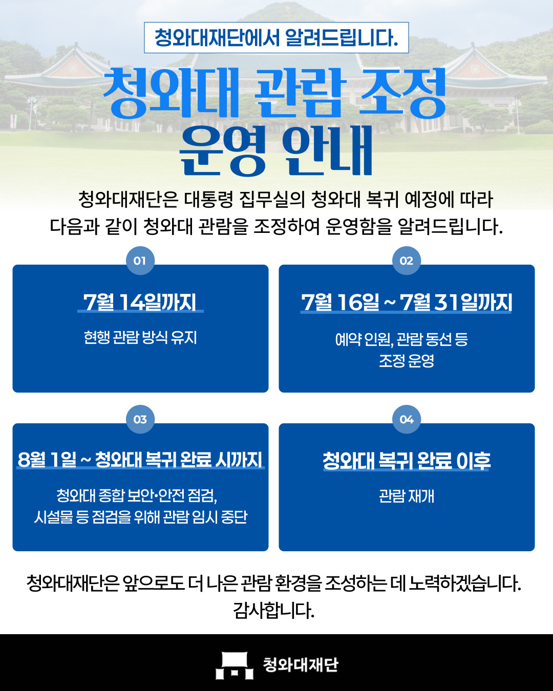 정부는 6월 10일 국무회의에서 청와대 복귀 관련 예비비 259억원을 의결하며 본격적인 복귀 준비에 착수했습니다. 청와대재단이 공개한 관람 조정 일정에 따르면:
