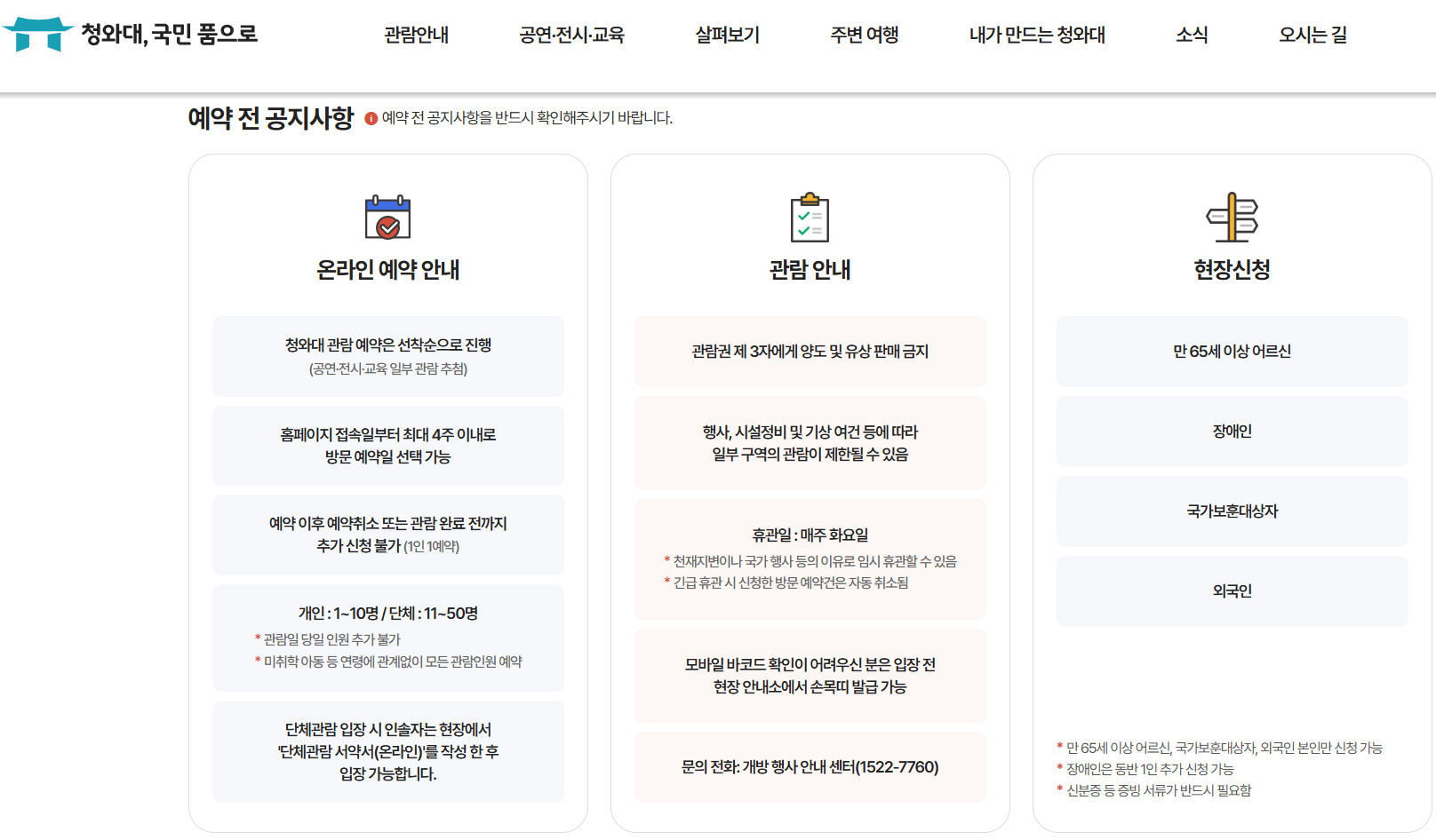 청와대 관람신청 예약은 기본적으로 온라인 사전 예약제이지만, 특정 대상자는 현장에서도 신청할 수 있습니다: