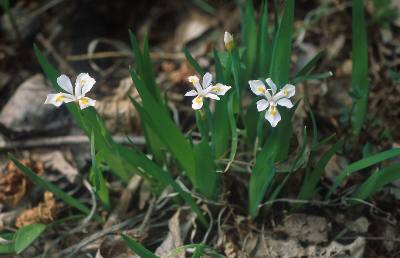 노랑무늬 붓꽃은 우리나라에서만 자라는 희귀 자생종으로, 흰색 꽃잎에 선명한 노란 무늬가 특징인 야생화입니다.