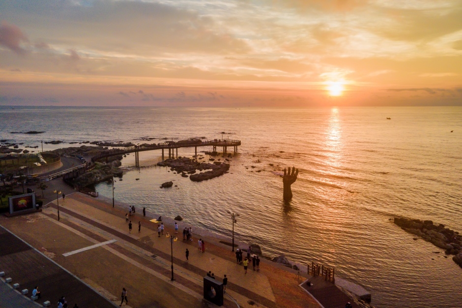 바다 위로 떠오르는 해를 배경으로 ‘상생의 손’ 조형물이 인상적으로 서 있어, 인생샷 명소로도 인기가 많습니다.