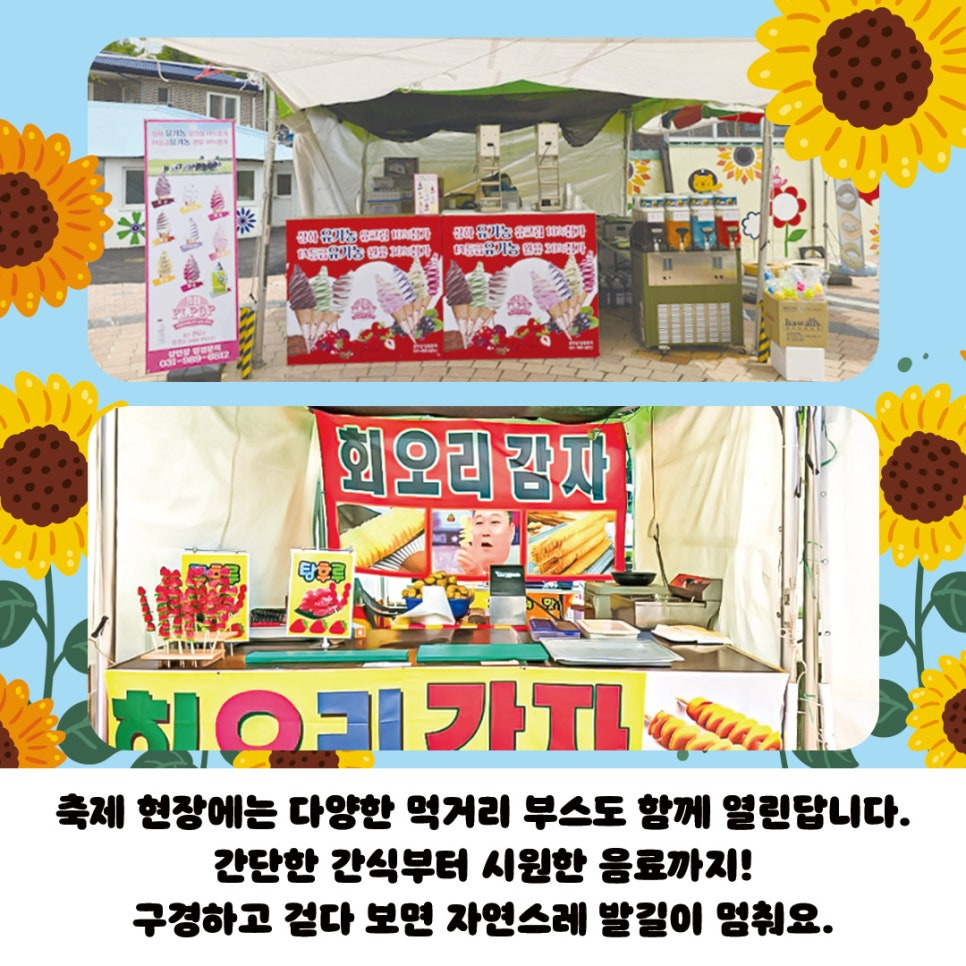 축제 개막식(6월 18일 오전 11시)에는 식전공연과 다양한 문화행사가 펼쳐지며, 축제 기간 내내 버스킹 공연과 해바라기 갤러리 등 다채로운 볼거리가 준비되어 있습니다.