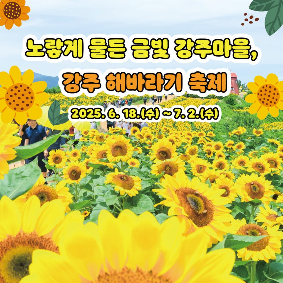 2025년 여름, 강주 해바라기 축제는 자연, 사람, 전통이 어우러진 전국 대표 꽃 축제입니다. 초여름의 햇살 아래 노란 해바라기와 정겨운 시골 풍경이 어우러진 강주마을에서 잊지 못할 추억을 만들어보세요. 강주 해바라기 축제는 매년 더 많은 사람들이 찾는 이유가 분명한, 진정한 힐링 여행지입니다.