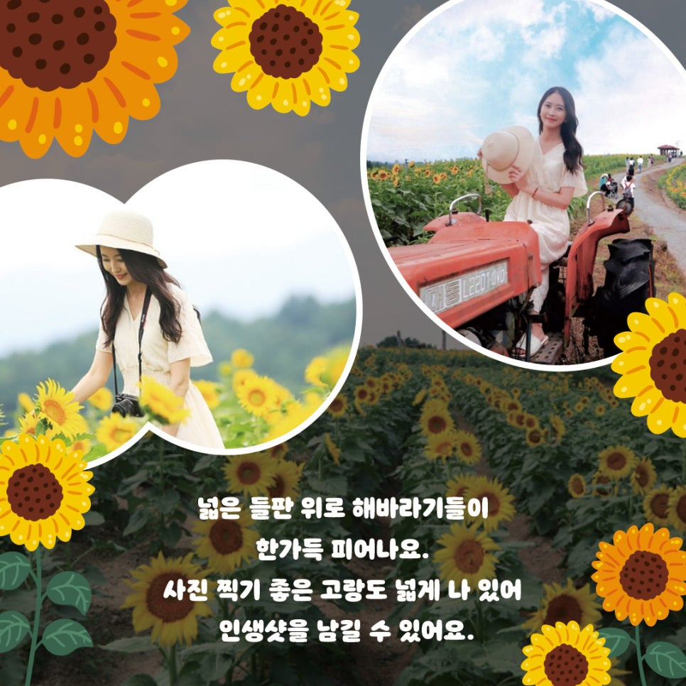 • 사진 찍기 좋은 시간: 오전 일찍 방문하면 한산하고 시원한 공기 속에서 산책할 수 있고, 오후 늦은 시간에는 해질 무렵 해바라기와 노을의 환상적인 조화를 감상할 수 있습니다. 노란 우산 무료 대여도 있으니, 포토존에서 감성 사진을 남겨보세요.