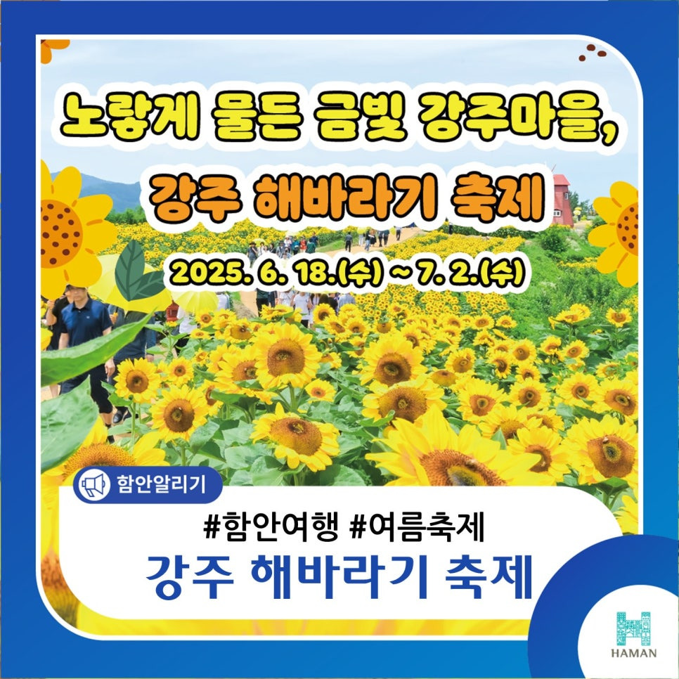 여름이 시작되는 6월, 초록과 노란빛이 어우러진 경남 함안의 작은 마을이 전국적인 꽃 명소로 변신합니다. 바로 ‘강주 해바라기 축제’가 펼쳐지는 강주마을입니다. 2025년에도 어김없이 찾아온 이 축제는 자연의 아름다움과 농촌의 정취, 그리고 따뜻한 사람들의 정성이 어우러진 특별한 경험을 선사합니다. 이번 포스팅에서는 강주 해바라기 축제의 모든 정보를 꼼꼼하게 소개하고, 미리 직접 방문한 생생한 팁까지 전해드릴게요.