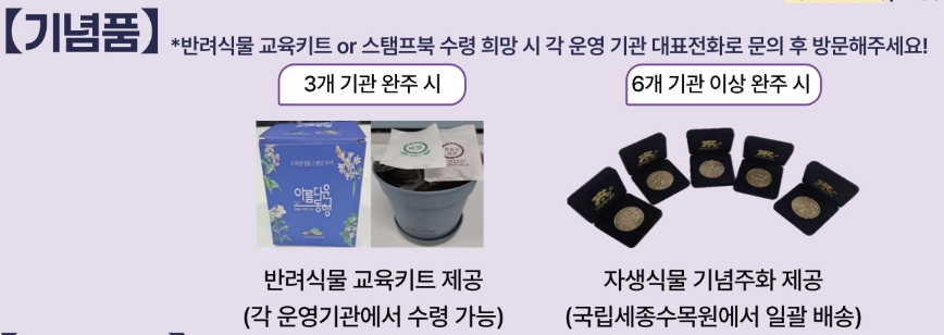 각 수목원을 방문하여 스탬프북을 수령한 후 도장을 찍으면 기념품을 받을 수 있는 기회가 주어집니다.