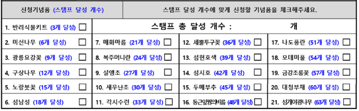 스탬프를 모은 뒤 조건을 충족하면 기념품을 신청할 수 있습니다.