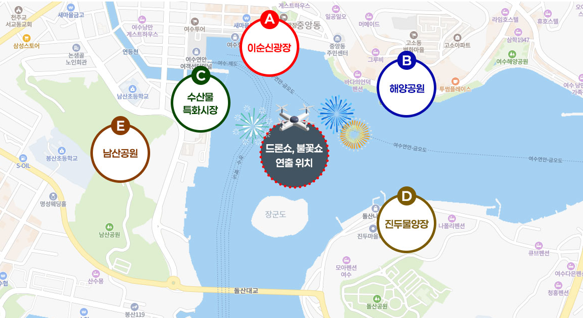 | A | 이순신광장 | 주무대, 공연·불꽃 동시 관람 |