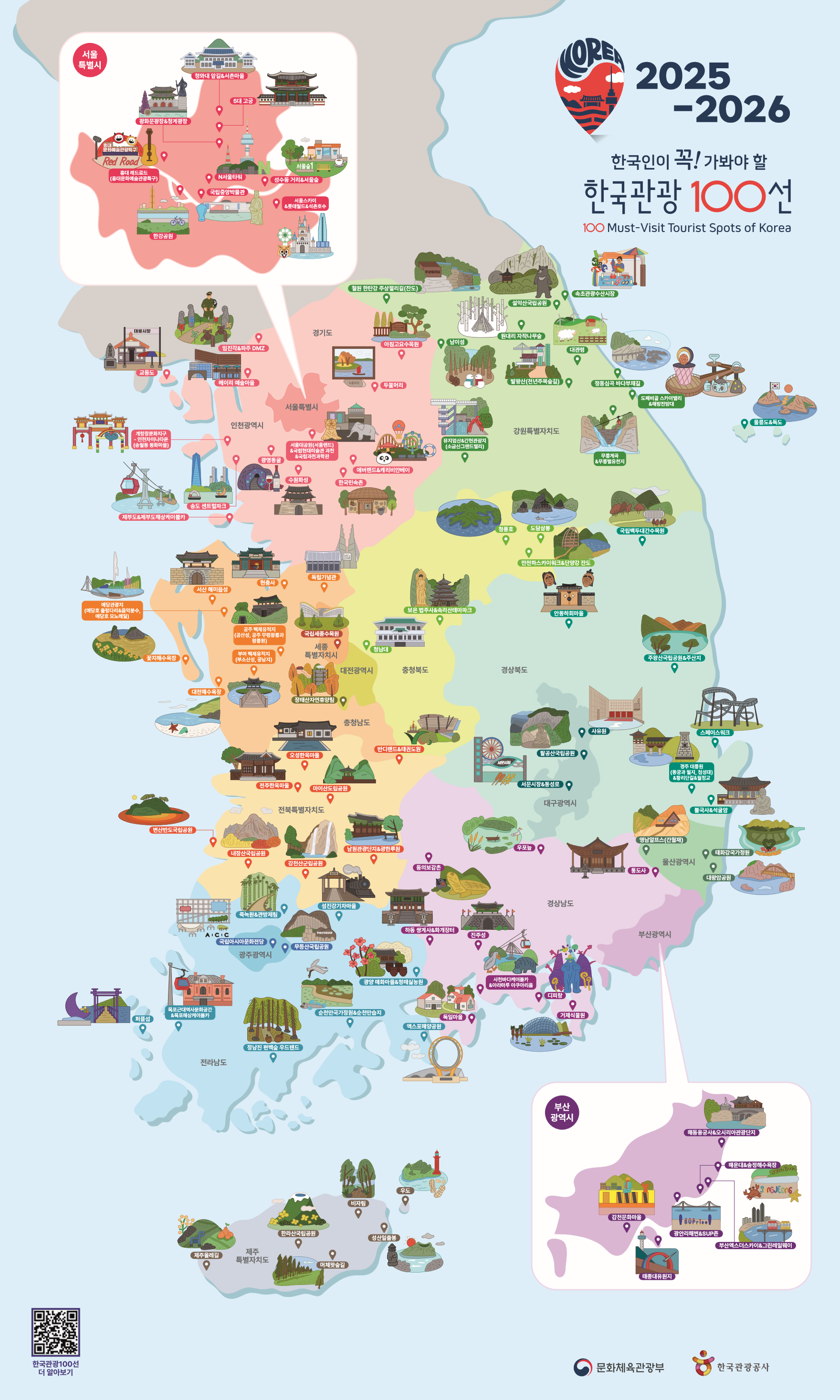 이번 2025~2026 한국 관광 100선에는 서울의 고궁부터 제주도의 자연 명소까지 전국 방방곡곡의 아름다운 장소가 고르게 선정되었습니다.
