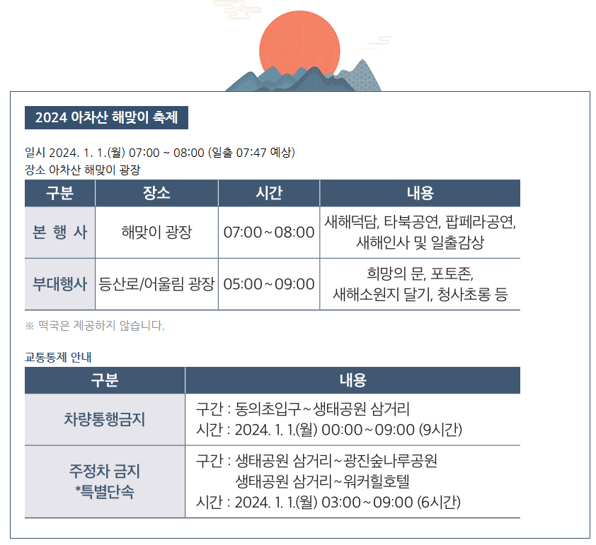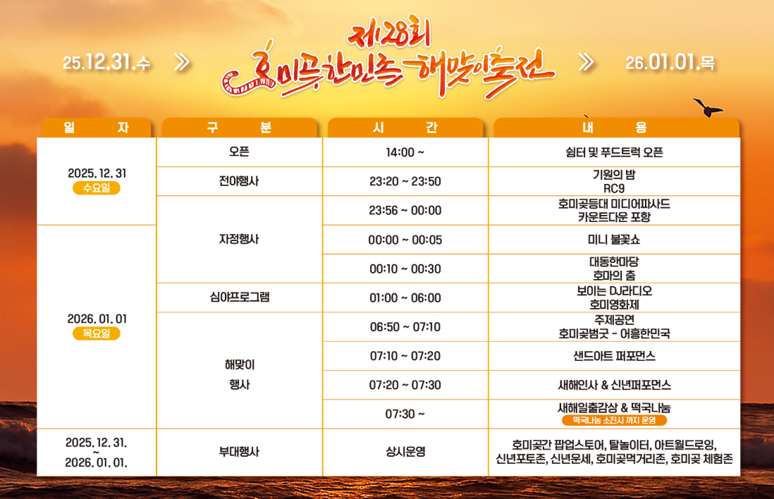 매년 12월 31일부터 1월 1일까지 해돋이 축제가 열리며, 새해 카운트다운과 불꽃놀이, 소망 기원 행사가 함께 진행됩니다.